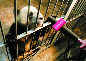 在曾有林驗(yàn)貨時(shí),飼養(yǎng)員楊海迪不失時(shí)機(jī)地給大熊貓們喂食礦泉水及蘋果、胡蘿卜等物。