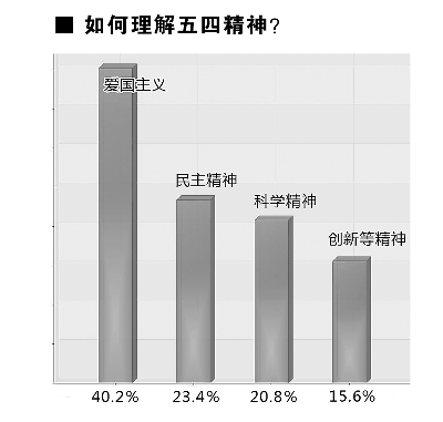 在對(duì)于五四精神的理解上,40.2%的受訪者選擇了“愛國主義”,認(rèn)為這是五四精神中首先需要傳承的精神遺產(chǎn),23.4%選擇“民主精神”,20.8%選擇“科學(xué)精神”,15.6%選擇“創(chuàng)新等其他精神”。調(diào)查顯示,國家、民族在大學(xué)生心中占據(jù)神圣的地位,75.4%的受訪者表示自己“為作為中國公民感到自豪”。