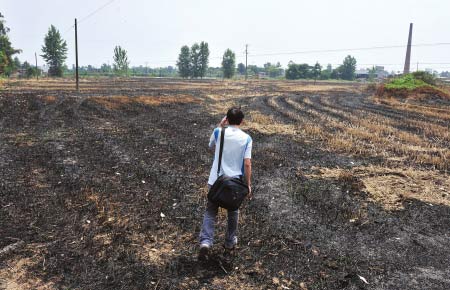 “這個(gè)村地里留下的秸稈,不敢說(shuō)是100%,至少90%都是燒了的!币徽诘乩锊逖淼拇迕窀嬖V記者,幾天前他就將地里的秸稈全部燒了,清理完畢后,在地里灌上水準(zhǔn)備插秧!笆崭顧C(jī)收完麥子后,還有半茬樁子留在地里,弄起來(lái)太麻煩,一把火燒了干凈!