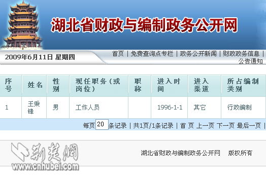湖北省財(cái)政與編制政務(wù)公開(kāi)網(wǎng)工作人員告訴記者,湖北省推行的是“陽(yáng)光編制”,只要發(fā)生人事變更,該網(wǎng)便會(huì)在第一時(shí)間更新數(shù)據(jù)。11日上午10時(shí),記者發(fā)稿前,王秉鋒的姓名仍?huà)煸诤笔∝?cái)政與編制政務(wù)公開(kāi)網(wǎng)上,所屬單位為紅安縣國(guó)土資源局。(記者張揚(yáng))