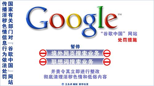 全國(guó)整治互聯(lián)網(wǎng)低俗之風(fēng)辦公室19日向媒體透露,國(guó)家有關(guān)部門已經(jīng)召見“谷歌中國(guó)”網(wǎng)站負(fù)責(zé)人,對(duì)該網(wǎng)站大量傳播淫穢色情內(nèi)容進(jìn)行執(zhí)法談話,宣布暫停該網(wǎng)站境外網(wǎng)頁(yè)搜索業(yè)務(wù)和聯(lián)想詞搜索業(yè)務(wù),并責(zé)令其立即進(jìn)行整改,徹底清理淫穢色情和低俗內(nèi)容。