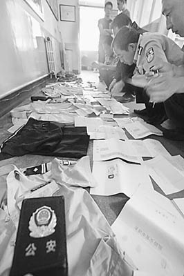 民警在搜查周某暫住在天平營村的住所時,查獲了偽造的內(nèi)蒙古自治區(qū)公安廳廳長令、調(diào)函,警用人員報告書、成立派出所報告書、安置卡,購買了警服、警號、警銜、警官證和法律法規(guī)書和私刻的公章以及冒充自治區(qū)公安廳某領導簽署的調(diào)他任薛家灣公安局局長的調(diào)令等大量假證件。(本報記者 李玉波)