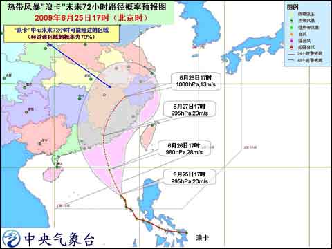 預(yù)計,風(fēng)暴中心將以每小時15-20公里的速度向西北方向移動,以后將轉(zhuǎn)向偏北方向移動,逐漸向廣東中部到福建南部一帶沿?拷瑥姸扔兴訌,并有可能于明天夜間到后天白天在這一帶沿海登陸。受“浪卡”和西南季風(fēng)的共同影響,今天晚上到明天白天,南海東部和南部海面將有6-8級大風(fēng),“浪卡”中心經(jīng)過的附近海面的風(fēng)力可達(dá)9-10級。