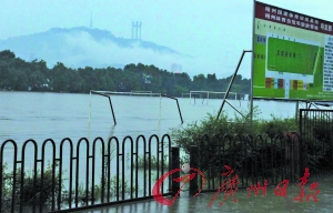 被譽(yù)為中國(guó)足球“明星搖籃”和培養(yǎng)中國(guó)足球裁判員“黃埔軍!钡膹V西梧州體育訓(xùn)練基地,位于緊臨西江的梧州市蝶山區(qū)龍湖鎮(zhèn),是原國(guó)家體委與地方共建的全國(guó)三大足球訓(xùn)練基地之一。前日以來(lái),隨著西江水位的不斷上漲,該體育訓(xùn)練基地開(kāi)始不斷被水蔓延。昨日下午,記者趕到時(shí),上百畝訓(xùn)練場(chǎng)地全部被大水淹沒(méi),水深處達(dá)兩米多,球場(chǎng)只露出一截40多個(gè)球門,讓人們還能認(rèn)得出來(lái)這里原來(lái)是一處足球場(chǎng)地。同時(shí),記者也看到附近居民的房屋的一樓已經(jīng)泡在水中。(記者王廣永)