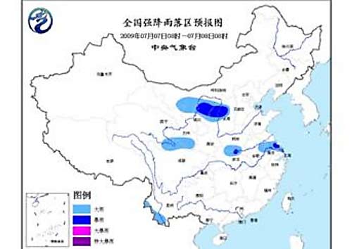 中新網(wǎng)7月7日電 中央氣象臺今日06時(shí)繼續(xù)發(fā)布暴雨預(yù)報(bào):預(yù)計(jì),今天白天到夜間, 內(nèi)蒙古西部、寧夏北部、陜西北部、山西北部、青海東南部、甘肅南部、四川北部、河南南部、湖北北部、蘇皖中南部、云南西南部等地的部分地區(qū)有大雨,其中內(nèi)蒙古河套地區(qū)、陜西北部、山西北部、湖北東北部、江蘇中部等地的部分地區(qū)有暴雨。