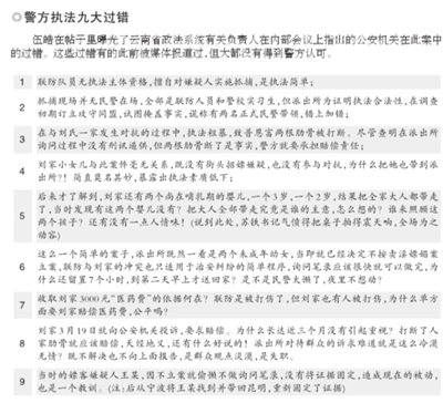 帖子中,伍皓披露云南省政法系統(tǒng)有關(guān)負(fù)責(zé)人在聽取調(diào)查進(jìn)展報(bào)告過程中,“用了半個(gè)多小時(shí)詳細(xì)指出公安機(jī)關(guān)的過錯(cuò)”。“當(dāng)案情逐漸清晰,特別是查出劉家的兩個(gè)女兒互換衣服、故意誘導(dǎo)聯(lián)防抓錯(cuò)人以實(shí)施敲詐的情節(jié),基層公安機(jī)關(guān)都覺得松了一口氣,有人在匯報(bào)中說‘看來案子并沒有辦錯(cuò)’,有關(guān)負(fù)責(zé)人立即怒目圓瞪、厲聲喝斥,‘什么沒有辦錯(cuò)!這個(gè)案子,我們公安機(jī)關(guān)是有過錯(cuò)的’!”