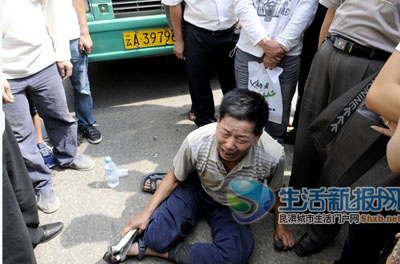 一名50多歲的男子擋在一輛77路公交車前,坐在地上痛哭,民警怎么勸說他也不愿意離開。男子稱:“這些城管太不講道理了,他們快把我的兒子打死了。”據(jù)該男子介紹,20多名城管人員昨日早上將其兒子打傷,兒子被送進醫(yī)院搶救,而打人的城管全部跑了,“實在是沒有辦法,我兒子不能白白受罪,無奈之下,我只能通過這種方法引起相關部門的重視!
