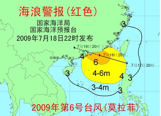 海洋預(yù)報臺稱,受今年第6號臺風(fēng)“莫拉菲”的影響,預(yù)計18日夜間到19日上午南海北部將出現(xiàn)6到8米的狂浪區(qū),臺灣海峽南部將出現(xiàn)4米的巨浪區(qū);廣東省東部沿海將出現(xiàn)4到6米的巨浪到狂浪,福建省南部沿海將出現(xiàn)2.5到3米的大浪,廣東省西部沿海將出現(xiàn)3到4米的大浪到巨浪,請沿海各有關(guān)單位及時采取防浪避浪措施,并關(guān)注我臺后續(xù)海浪預(yù)警報。