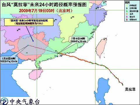 今年第6號臺風“莫拉菲”(MOLAVE)的中心已于19日凌晨0時50分在廣東省深圳市大鵬半島沿海登陸,登陸時中心附近最大風力有13級(38米/秒),中心最低氣壓965百帕。登陸后,“莫拉菲”強度逐漸減弱,19日凌晨4時在深圳市境內(nèi)減弱為強熱帶風暴,19日早晨5時,強風暴中心位于珠江口北部,就是北緯22.7度、東經(jīng)113.7度,中心附近最大風力有10級(28米/秒)。