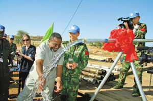 蘇丹是一個(gè)極度缺水的國(guó)家,常年動(dòng)亂的一個(gè)重要原因就是爭(zhēng)奪水源。西方地質(zhì)學(xué)家勘測(cè)后曾認(rèn)定北部達(dá)爾富爾地區(qū)無地下水。北京軍區(qū)給水團(tuán)維和官兵的主要任務(wù)是在這里進(jìn)行水源勘察并構(gòu)筑供水井,解決達(dá)爾富爾地區(qū)維和部隊(duì)及維和警察生活保障用水。去年10月16日上午,一股清泉從火成巖中噴涌而出,標(biāo)志著我給水團(tuán)官兵開創(chuàng)了聯(lián)合國(guó)維和部隊(duì)用水自給的先河,同時(shí)也書寫了我軍工兵首次在國(guó)外找水打井成功的歷史。