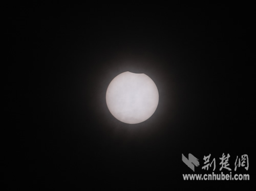 22日上午8時(shí)14分,日全食初虧在湖北武漢顯現(xiàn),圖為記者在湖北日?qǐng)?bào)傳媒大廈拍攝的初虧奇觀。