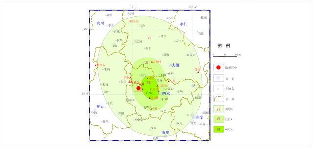 1. 本次地震宏觀震中位于姚安縣官屯鄉(xiāng)官屯村-馬游村一帶,最大烈度為Ⅷ度,等震級(jí)形狀呈橢圓形,長(zhǎng)軸走向?yàn)楸蔽飨,總面積6958平方千米。