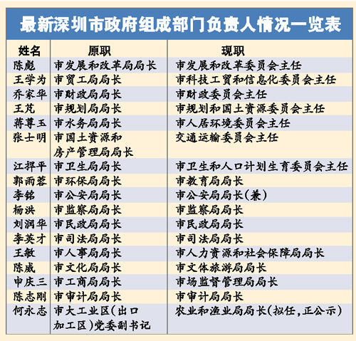 具體是,繼續(xù)留任的5人:李銘留任深圳市公安局局長(zhǎng);楊洪留任市監(jiān)察局局長(zhǎng);劉潤(rùn)華留任深圳市民政局局長(zhǎng);李英才留任深圳市司法局局長(zhǎng);陳志剛留任深圳市審計(jì)局局長(zhǎng)。