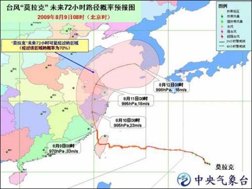 中新網(wǎng)8月9日電 據(jù)中國氣象局網(wǎng)站消息,中央氣象臺8月9日上午發(fā)布臺風紅色緊急警報:今年第8號臺風“ 莫拉克 ” (MORAKOT )的中心今天上午8時位于福建省霞浦縣南偏東方大約90公里的海面上,就是北緯25.9度、東經(jīng)120.4度,中心附近最大風力有12級(33 米 / 秒),中心最低氣壓970百帕 。