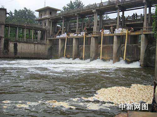 中新社徐州八月九日電 (邵國棟)記者今天來到受嚴重砷污染的江蘇省邳州市邳城鎮(zhèn)城河節(jié)制閘現(xiàn)場,十余名工人正在閘站上往河道里投放一種黃色的粉末。工人稱這種叫三氯化鐵的化學物質主要用來降低水體砷化物濃度,他們已經(jīng)在此晝夜堅守多日。