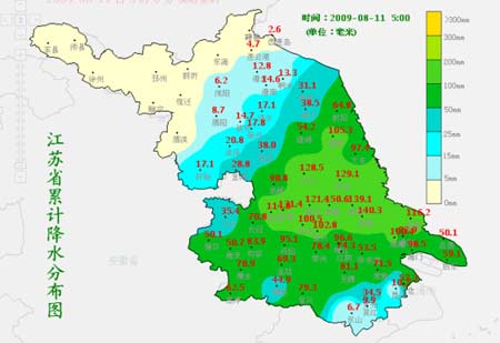 受“莫拉克”影響,10日江蘇淮河以南地區(qū)出現(xiàn)大范圍暴雨到大暴雨。據(jù)統(tǒng)計,截至11日05時, 江蘇38個臺站24小時雨量在50毫米以上,其中南通、泰州、鹽城、鎮(zhèn)江、揚州共14個臺站在100毫米以上,最大雨量出現(xiàn)在姜堰(150.6毫米)。另據(jù)加密自動站觀測,有118個站雨量在100毫米以上,最大雨量姜堰蔣垛(179.3毫米)!澳恕边使淮河以南地區(qū)普遍出現(xiàn)7-8級大風,沿海9-10級,最大風速達11級 (28.6m/s,射陽丹頂鶴保護區(qū))。
