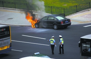 今天9時30分,(北京市)建國門內(nèi)大街由東向西方向,一輛行駛中的黑色帕薩特車突然自燃,所幸無人受傷。