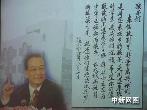 時隔兩個多月,讓孩子們激動萬分的是居然盼到了溫總理的親筆回信。溫總理在回信中說:“你們是周恩來故鄉(xiāng)的孩子,是‘周恩來班’的學生,我為你們祝福。希望你們像敬愛的周恩來爺爺那樣從小立志‘為中華之崛起而讀書’,長大成為祖國的棟梁之才。”