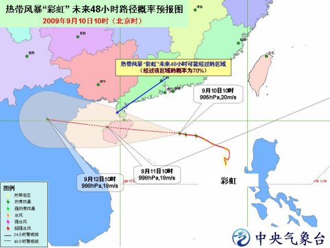 中新網(wǎng)9月10日電 中央氣象臺今日發(fā)布臺風橙色警報:今年第13號熱帶風暴“彩虹”的中心今天上午10時位于海南省文昌市東偏南方向大約400公里的南海北部海面上,就是北緯19.0度、東經(jīng)114.7度,中心附近最大風力有8級(20米/秒)。