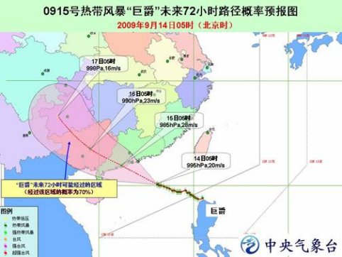 中新網(wǎng)9月14日電 中央氣象臺(tái)今日06時(shí)發(fā)布臺(tái)風(fēng)橙色警報(bào):今年第15號(hào)熱帶風(fēng)暴“巨爵”(Koppu ,名字來(lái)源于日本,指巨爵星座)的中心今天早晨 5 時(shí)位于廣東陽(yáng)江東南方大約 480 公里的南海北部海面上,就是北緯20.1度、東經(jīng)116.2度,中心附近最大風(fēng)力有9級(jí)(23 米/秒)。