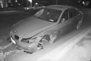 在滬南路陳春路口,這輛“瘸了腿”的牌號為滬G16281的紅色寶馬轎車仍停在路邊,右前擋風玻璃已碎成網(wǎng)狀,據(jù)說這是騎車人被撞后彈到擋風玻璃上所留下的。車的左前輪已不見蹤影……幾名目擊者回憶起事發(fā)經(jīng)過:由于滬南路正在拓寬,相向行駛的車輛公用北向南車道,地上劃有清晰的區(qū)分標識。誰料,這輛本應(yīng)是由南向北行駛的寶馬車,竟駛上了北向南車道上,“當時‘寶馬’速度很快,直接就把那輛正常行駛的電動車撞了!睂汃R車將騎車人撞飛后,并未停車,而是繼續(xù)逆向前行,又與一輛相向行駛的銀色帕薩特轎車發(fā)生碰撞。