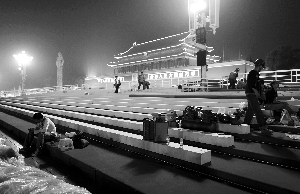 昨日,天安門城樓前東西兩側(cè)、人民大會(huì)堂北門外臨時(shí)觀禮臺(tái)上,工人開始加裝長(zhǎng)凳,并鋪設(shè)紅色地毯。前日,孫中山像亮相廣場(chǎng)。