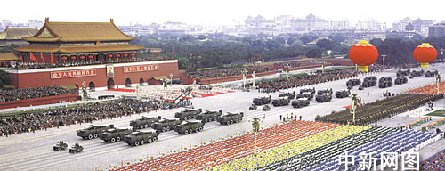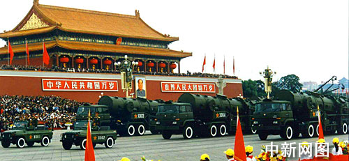 新中國五十周年國慶閱兵二十五個(gè)戰(zhàn)車方隊(duì)中最后四個(gè)方隊(duì)展示的是中國自力更生研制的戰(zhàn)略、戰(zhàn)術(shù)地地導(dǎo)彈系列,顯示中國常規(guī)與核戰(zhàn)略導(dǎo)彈反擊力量的整體作戰(zhàn)能力,受閱戰(zhàn)略導(dǎo)彈體積小了、威力更大了、機(jī)動(dòng)性更強(qiáng)了,已從過去的固定發(fā)射形式發(fā)展到野外機(jī)動(dòng)發(fā)射,具有全方位、全天候作戰(zhàn)能力和較強(qiáng)的防偵察、抗干擾能力。
