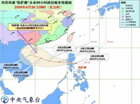 位于菲律賓以東海面的熱帶低壓于26日8時發(fā)展為今年第16號熱帶風(fēng)暴,中文名“凱薩娜”,英文名“Ketsana”,(名字來源于老撾,含義:一種樹),8時其中心位于菲律賓馬尼拉東偏北方大約190公里的海面上,就是北緯15.2度、東經(jīng)122.7度,中心附近最大風(fēng)力有8級(18 米/秒),中心最低氣壓為992 百帕。
