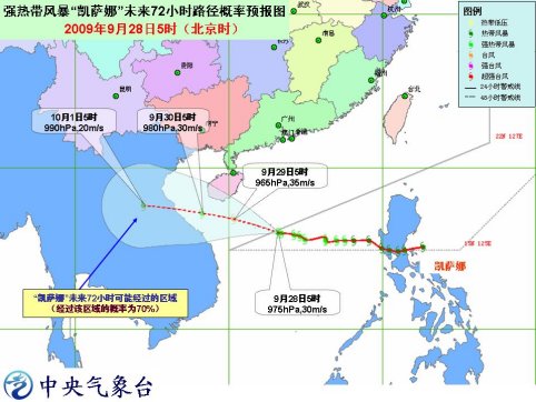 “凱薩娜”的中心28日5時(shí)位于海南省三亞市東南方約470公里的南海中部海面上,就是北緯16.1度、東經(jīng)113.3度,中心附近最大風(fēng)力有11級(jí)(30米/秒),中心最低氣壓為975百帕。