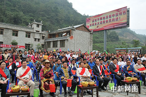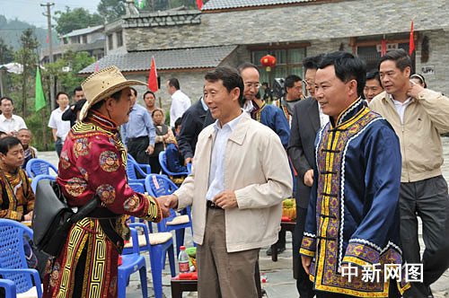 當(dāng)日的涼風(fēng)埡卓卓羌寨,處處洋溢著歡樂祥和的喜慶氣氛:羌族群眾身著節(jié)日盛裝喜形于色,孩子們手持小國旗歡快地嬉戲,羌寨廣場上正在舉行“建國60周年圖片展”……。上午9時40分,當(dāng)李崇禧、歐澤高、吳靖平、曾萬明等省市領(lǐng)導(dǎo)來到羌寨廣場時,熱情好客的羌族群眾紛紛圍上去向他們獻(xiàn)上羌紅。李崇禧關(guān)切地向老鄉(xiāng)們詢問災(zāi)后重建進(jìn)展及當(dāng)前生產(chǎn)生活情況,他飽含深情地說:“今天是偉大祖國60歲的生日,受省委書記劉奇葆同志、省長蔣巨峰同志的委托,我們專程來看望大家,并和大家一起過節(jié)!