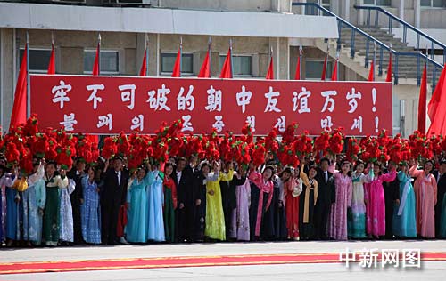 溫家寶一行乘車前往平壤市區(qū)途中,數(shù)十萬平壤市民身著節(jié)日盛裝,揮舞中朝兩國國旗、花束和標語,高呼中朝友好口號,夾道歡迎。溫家寶在金英日陪同下,站在敞篷汽車上向歡迎群眾揮手致意,并多次下車,與他們握手。車隊途經(jīng)平壤凱旋門時,朝鮮少先隊員向溫家寶敬獻鮮花,并給溫家寶系上紅領巾。