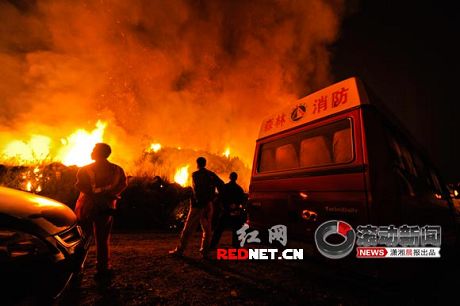 8日晚9點(diǎn)左右,記者趕到現(xiàn)場。在永和鎮(zhèn)內(nèi)即可看到遠(yuǎn)遠(yuǎn)一山頭火光沖天,循著火光記者找到了事發(fā)點(diǎn)。此時(shí)爆炸點(diǎn)附近已被封閉,現(xiàn)場救援人員正在點(diǎn)燃路邊的雜草,火勢越燒越旺,瞬間整個(gè)山頭都被大火覆蓋,半邊天空都被燒紅了。