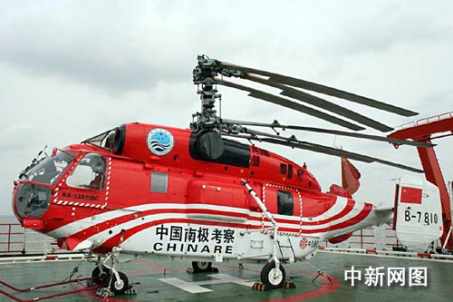 在“雪龍”號船尾的停機坪上,記者見到了中國南極考察首架自備卡-32直升飛機。由于在航行過程中需要存放在船上的機庫中,所以飛機螺旋槳的旋翼還未展開。船員告訴記者,該型直升機吊掛能力可達4噸,是以前船載機型的4倍左右,成為南極地區(qū)目前使用的最大噸位直升機。它可直接進行船岸之間來回運輸,更好地滿足南極新老三座考察基地的物資保障需求。另外,“雪龍”號此次科考任務(wù)同樣將配備兩架直升飛機,除了該架自備卡-32外,另外一架從國外租借的直升飛機將在新西蘭上船。