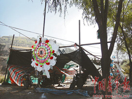 10月20日上午11時許,山西省呂梁市臨縣林家坪鎮(zhèn)白家峁村。村口不遠(yuǎn)靠近公路的空地上,有幾個用棚布搭起的簡易帳篷,有的被燒得只剩下幾塊破布,在秋風(fēng)中無力地?fù)u曳著。這是幾個月前村民為護(hù)礦搭起來的,現(xiàn)在成了村民郝兔照的靈堂。他的棺材已經(jīng)在這里放了8天,旁邊擺放著花圈、供品。