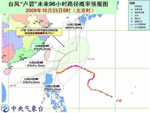 受“盧碧”和南下弱冷空氣的共同影響,23日白天至夜間,臺灣以東洋面、巴士海峽、巴林塘海峽、臺灣東南部沿海將有8-10級大風,部分海域或地區(qū)陣風可達11-12級;“盧碧”中心經(jīng)過的附近海域的風力有11-12級,陣風可達13-14級;臺灣海峽、東海南部、南海東北部、福建中部沿海也將有6-7級大風,部分海域或地區(qū)陣風可達8-9級;臺灣東北部有大到暴雨,局部有大暴雨。