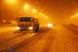 24時(shí)整,在飄零的雪花中,北京環(huán)衛(wèi)集團(tuán)的40輛除雪車一齊發(fā)動(dòng),奔赴全市作業(yè)區(qū),為今天早高峰道路暢通連夜噴灑融雪劑除雪。