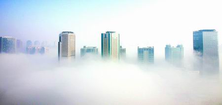 前兩日,鄭州遭遇有氣象記錄以來(lái)最大的暴雪襲擊。昨天早上,暴雪后鄭州市區(qū)出現(xiàn)霧海奇觀(guān),市區(qū)建筑在霧中若隱若現(xiàn)猶如“海市蜃樓”,讓人嘆為觀(guān)止!翱炜,東區(qū)的大樓好像在云朵之上似的!”昨日一大早,很多市民打來(lái)熱線(xiàn)反映此事。
