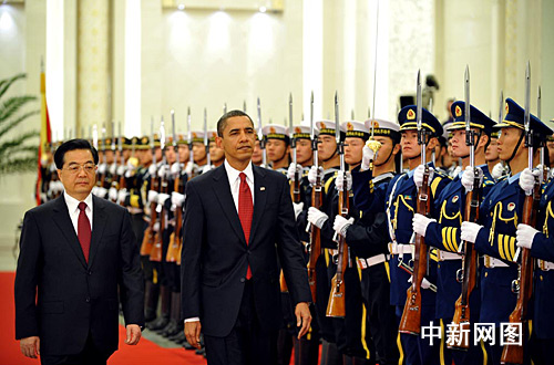 中新網北京11月17日電 (記者 張朔)中國國家主席胡錦濤17日上午約9點50分在人民大會堂北大廳舉行儀式,歡迎美國第44任總統(tǒng)奧巴馬對中國進行國事訪問。