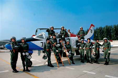 這個(gè)英雄群體共有16名殲擊機(jī)女飛行員,分別來自陜西、遼寧、河北、山東、山西、四川、江蘇、浙江、湖北9個(gè)省,最大24歲,最小22歲,是空軍2005年招收的第8批女飛行學(xué)員中的佼佼者。4年來,她們輾轉(zhuǎn)航空大學(xué)、兩所飛行學(xué)院,歷經(jīng)基礎(chǔ)教育、初教機(jī)訓(xùn)練、高教機(jī)訓(xùn)練3個(gè)階段,實(shí)現(xiàn)了從一名高中生到軍人再到女飛行員的人生飛躍。她們用堅(jiān)韌、智慧克服了常人難以想象的困難,從仰望藍(lán)天到擁抱藍(lán)天并最終融入藍(lán)天。在她們身上,既承載著中國軍人的共同使命,也閃爍著自己特有的光芒。