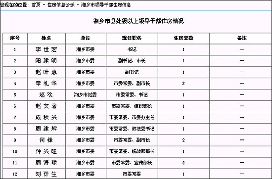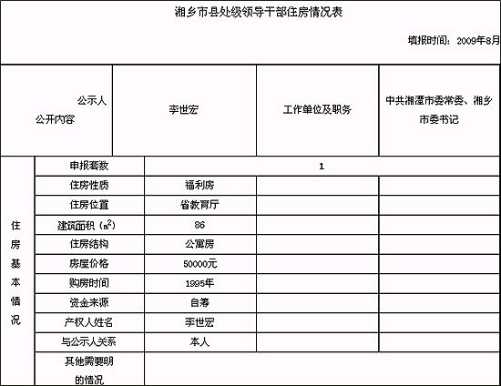 10月初,湘鄉(xiāng)市要求縣處級(jí)領(lǐng)導(dǎo)干部對(duì)住房情況進(jìn)行申報(bào),申報(bào)內(nèi)容包括自建房、參與單位集資建房、購(gòu)買(mǎi)福利房、經(jīng)濟(jì)適用房、商品房、租房、出賣(mài)和出租房屋的情況,以及住房所在地址、產(chǎn)權(quán)所有人、建筑面積和使用面積、房屋造價(jià)或價(jià)格、付款數(shù)額、資金來(lái)源等。
