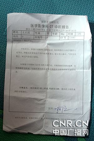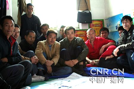 說(shuō)話的人叫鐘家泉,是這群農(nóng)民工的代表,記者見到他是在深圳市郊的一處簡(jiǎn)易房?jī)?nèi),包括廁所在內(nèi),房間面積不超過(guò)10平米,而這里卻住著他的10多位工友,地上沒(méi)有床,救濟(jì)站提供的棉被是房間里唯一的家具。這些人有的因?yàn)椴⊥匆呀?jīng)無(wú)法工作,有的因?yàn)橐伤茐m肺而被包工頭辭退,難聞的氣味和對(duì)死亡的恐懼彌漫著整個(gè)房間。他們因?yàn)槁殬I(yè)病檢查受阻而走到一起,目前已有120多人。他們都有不同程度的咳嗽、胸悶、呼吸困難等癥狀。工人們說(shuō),十多年來(lái)他們一直在深圳當(dāng)炮工,每天都要吸入大量粉塵,但以前并不知道這會(huì)危及生命。他們說(shuō),自己已經(jīng)有兩三個(gè)老鄉(xiāng)死了,死掉的時(shí)候他們都親眼看到了,現(xiàn)在感覺(jué)自己的身體和死掉人的癥狀幾乎相同。而一位在湖南張家界中醫(yī)院做過(guò)檢查的工友說(shuō):醫(yī)生照出來(lái)一看,說(shuō)這個(gè)病很嚴(yán)重,最后,我跟他說(shuō)明了,我說(shuō)我打了幾十年風(fēng)鉆,他說(shuō)肯定是塵肺病。