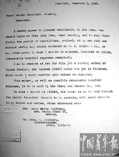 在丹麥,記者收集到的史料還包括:1938年2月7日,F.L.史密斯上海公司女秘書史丹倫致辛德貝格的信;1938年5月21日、6月9日,就日商調(diào)查中方工廠底細,F(xiàn).L.史密斯公司人員分別從香港、東京致江南水泥廠,標(biāo)明“保密件”或囑“不要讓別人知道”等字樣的函;1938年6月初,辛德貝格在日內(nèi)瓦披露了南京大屠殺真相后準(zhǔn)備移民美國,他于7月4日離開奧胡斯時的答記者問,等等。