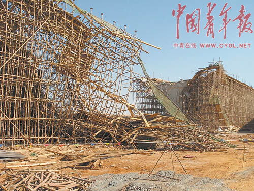 事故發(fā)生的前幾分鐘,李勇仍在腳手架上作業(yè),他剛下來不久,一聲像“翻斗車倒鋼管”的刺耳巨響就從背后襲來,他轉(zhuǎn)身一看,正在進(jìn)行混凝土澆筑的8米多高的橋面已經(jīng)砸到了地面,橋體四周的腳手架也倒了下來,隨之傳來的就是凄厲的哭喊聲。