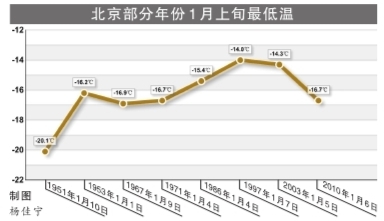 “最低氣溫-16.7℃”,昨天凌晨1點(diǎn),(北京)市氣象臺(tái)發(fā)布的數(shù)據(jù)顯示,繼5日的-15.6℃之后,昨天凌晨,南郊觀象臺(tái)監(jiān)測(cè)的最低氣溫跌至-16.7℃,刷新了38年來(lái)1月上旬最低溫度紀(jì)錄。根據(jù)預(yù)報(bào),這還不是今冬寒冷天氣的終結(jié),明天,全市可能普降小到中雪,最低氣溫仍將徘徊在-12℃左右。