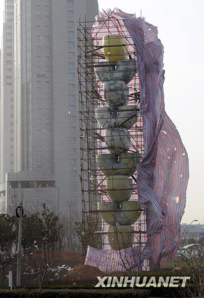 1月18日,記者在鄭州市鄭東新區(qū)如意河畔看到,20多米高的雕塑《金色的夢》仍被腳手架包裹著,九組“U”字形體疊加而成的麥穗造型的不銹鋼主體已完工,工人正在進(jìn)行表面處理。鄭州市城市雕塑建設(shè)項(xiàng)目部證實(shí),《金色的夢》是鄭州市政府投資200萬元建設(shè)的大型雕塑,以金色的茁壯的麥穗,意喻河南作為農(nóng)業(yè)大省對我國糧食安全的重要貢獻(xiàn)。按照設(shè)計,將用5萬多張、重約1公斤的98%的金箔貼覆,金箔價值達(dá)22萬元。
