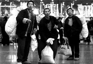 在第三候車室門口,搬運(yùn)工陳師傅拉著空行李車一過來,呼啦一下圍上去二三十人,不到一分鐘,行李車上已有近10個大包。陳師傅說,現(xiàn)在一天最多跑40趟。