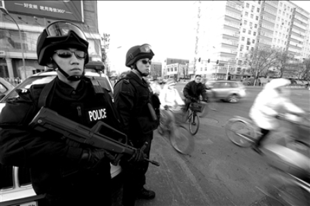 昨天上午,記者在西單文化廣場前看到,一輛武裝處突車閃爍著警燈?吭诼放,兩名身著作戰(zhàn)服的特警隊員全副武裝,警覺地注視著長安街附近的人流和車流。
