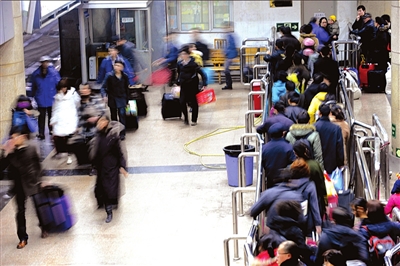 據(jù)了解,目前返程客流主要集中在京滬、京哈的哈爾濱、合肥,京九線河南、湖南兩省的沿線主要城市,以探親回京人員、旅游客流為主。為此,北京各火車站已經(jīng)做好返程預(yù)案,在哈爾濱、齊齊哈爾、洛陽、襄樊、信陽等方向新增節(jié)后臨客。北京南站也增開京津城際動(dòng)車,發(fā)車間隙達(dá)到5分鐘一趟,方便到天津、塘沽探親、訪友的旅客返京。