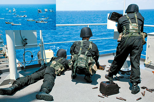 10時05分,“微山湖”艦特戰(zhàn)隊員和反海盜分隊按部署就位。指揮員下令發(fā)射信號彈進行警告,但數(shù)艘可疑快艇繼續(xù)向編隊靠近。10時39分,沖在最前面的幾艘快艇已接近至“微山湖”艦左舷5鏈(925米)處。指揮員果斷下令,使用重機槍進行警告攔阻射擊(見上圖,左上角為可疑快艇)。“嗒嗒嗒……”槍聲響起,可疑快艇停止了前進,不久便調(diào)頭離去!拔⑸胶迸炛匦抡{(diào)整航向,于當?shù)貢r間3月21日凌晨將“振華9號”護送至安全海域。