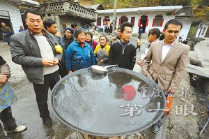 納雍縣少數(shù)民族眾多,這對新人都是漢族,新郎叫嚴大朵,新娘叫榮美翼。為了舉行婚禮,半個多月前,專門在新郎家門口修了一個水池。全家人都省吃儉用,到處找水存進這水池當中,村子里其他鄉(xiāng)親也來幫忙。到婚禮舉辦的前一天,兩米見方的水池終于全部裝滿。家里又找了幾口大鐵鍋,裝滿清水備用。